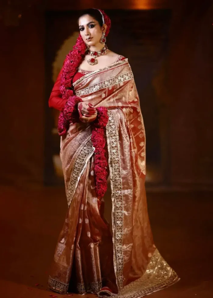 118,500.00৳Elegant Red Maslin Fabric Saree w/ Golden Thread (Embroidery & Hand Zardozi)