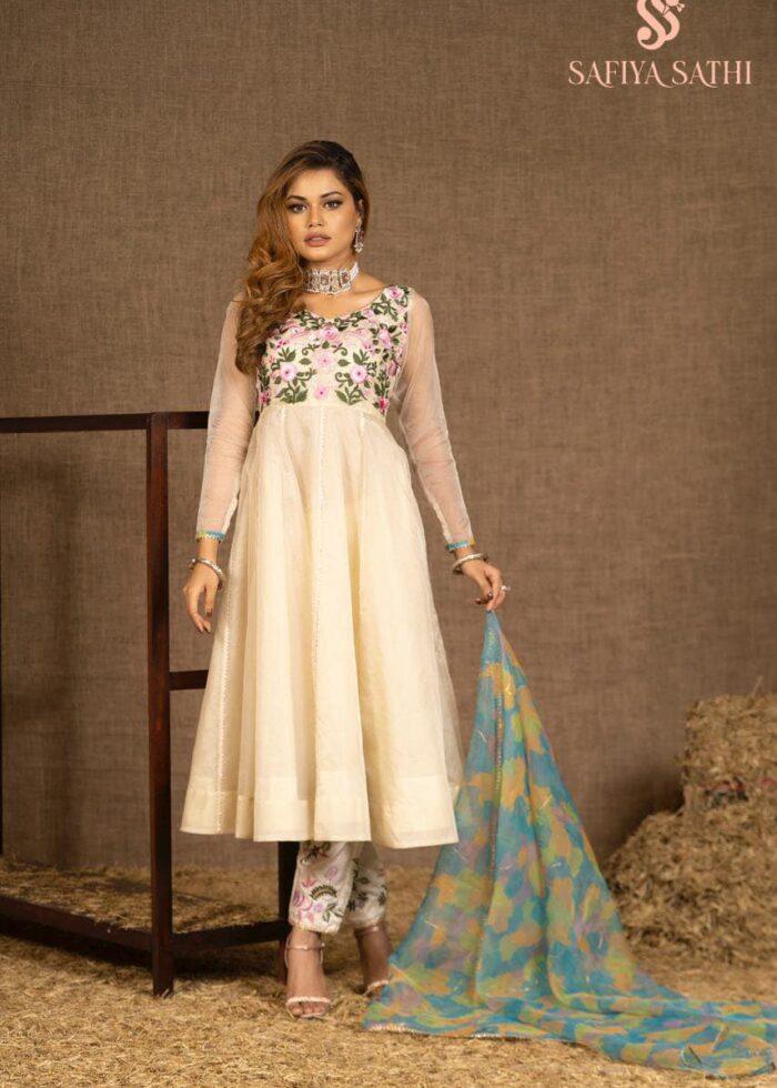 Off-White Cream Muslin Three-Piece with Gorgeous Hand Embroidery & Multicolor Floral Work