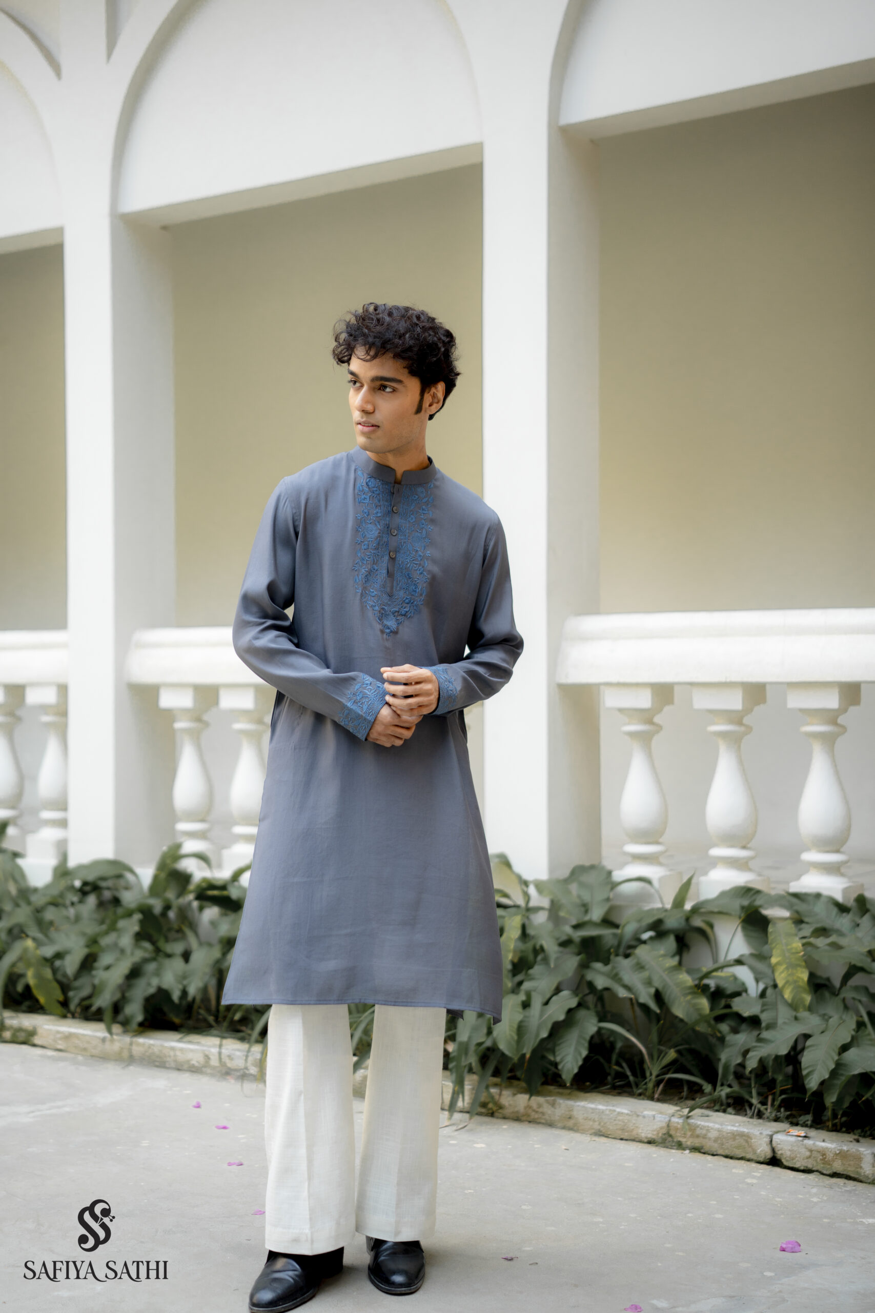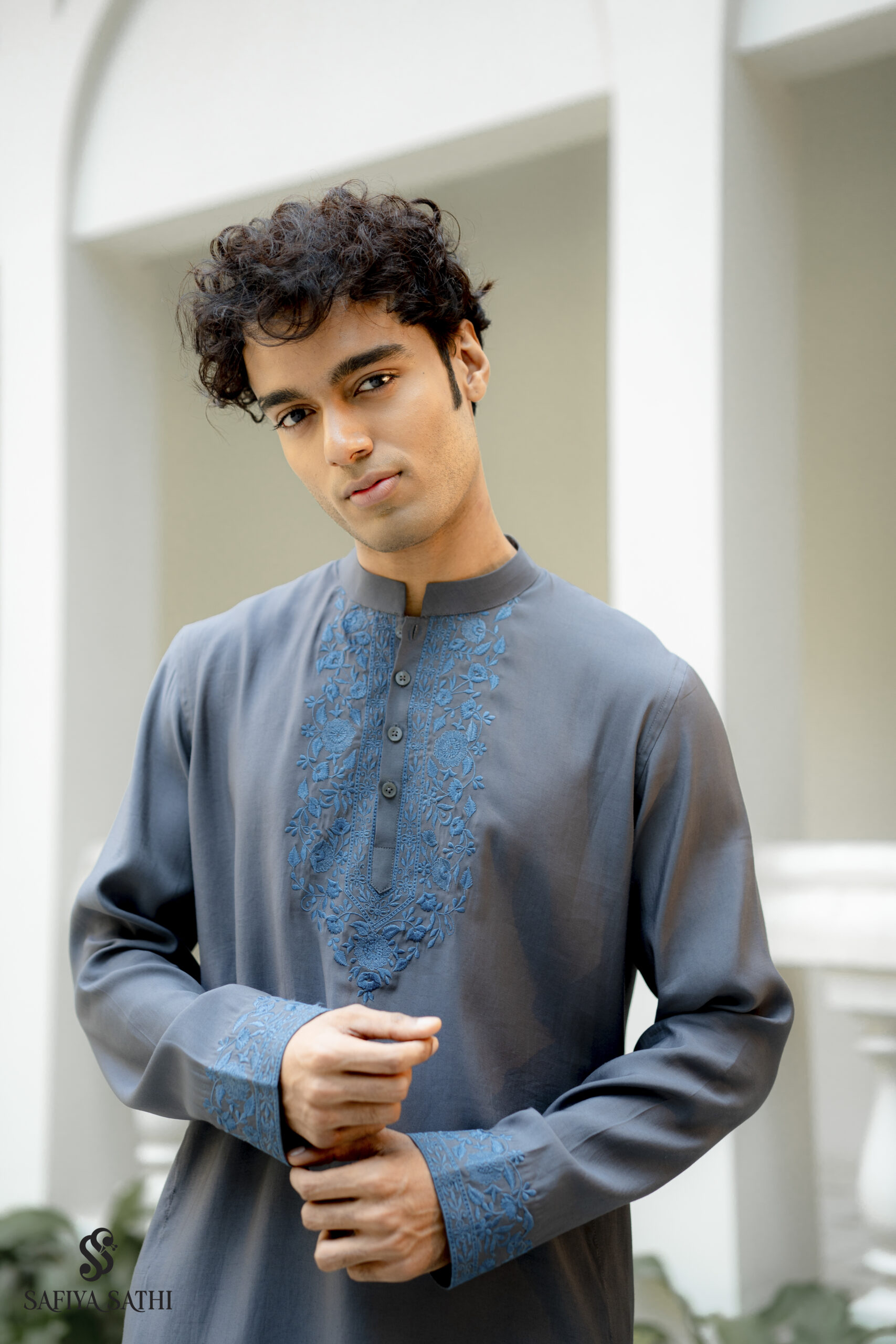 What sets this piece apart is its hand-embroidered steel blue floral motif — a lush arrangement of blooms and trailing vines that frames the placket and flows gracefully down the chest, with matching embroidery echoing at the cuffs for a cohesive, polished finish. The delicate threadwork contrasts beautifully against the cool grey base, adding depth without overwhelming the silhouette.