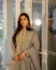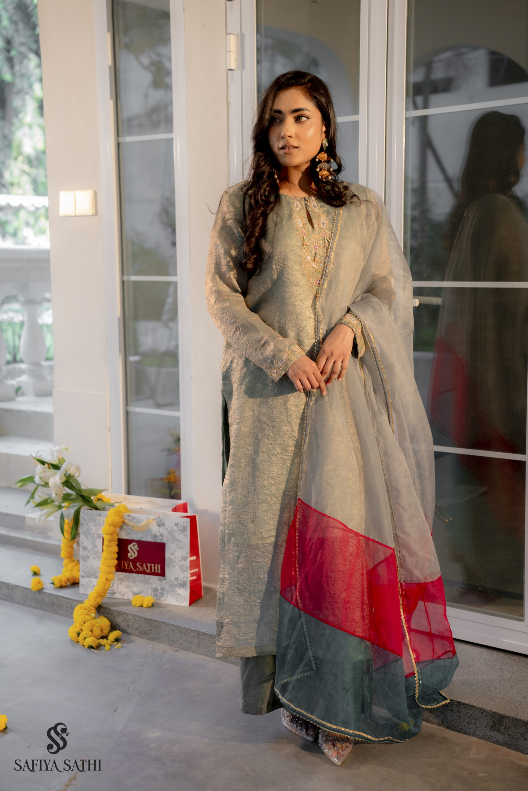 The dupatta is rendered in sheer ashy grey organza, soft and fluid, completing the look with an airy, ethereal drape.