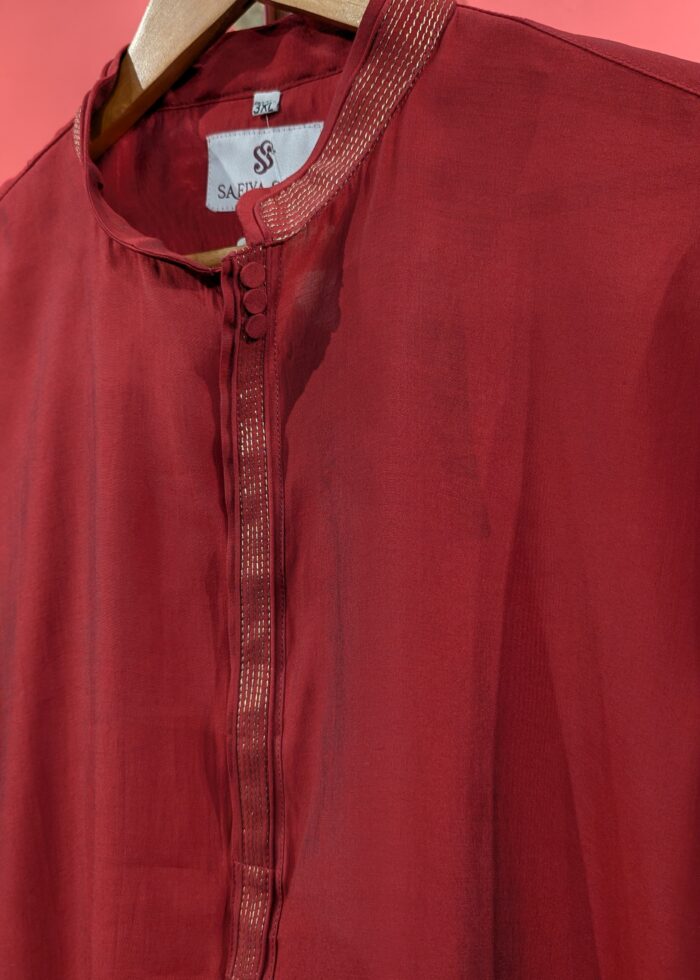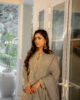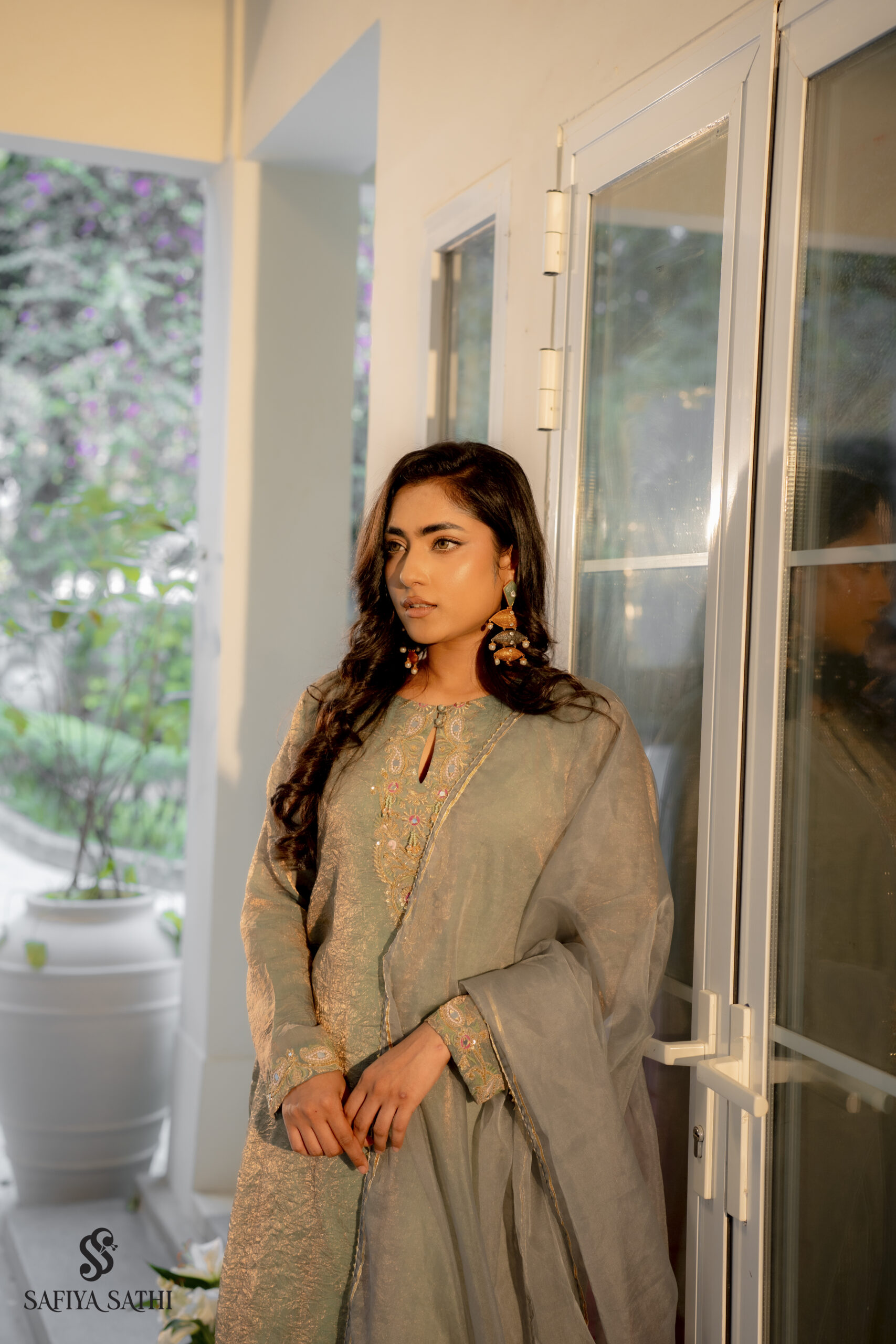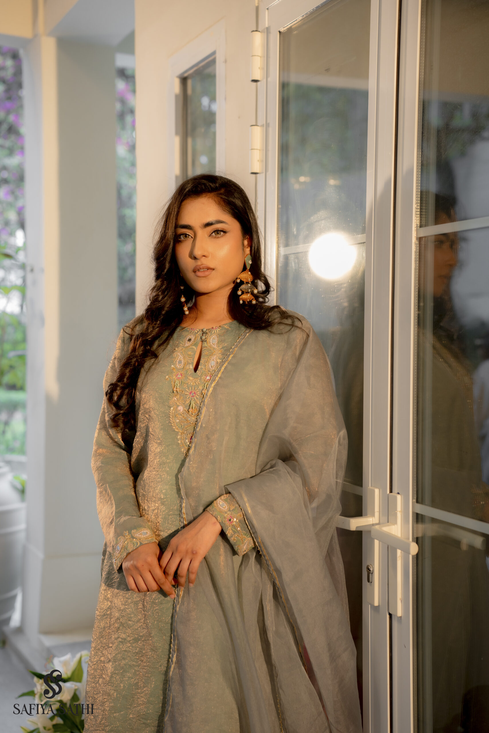 Draped in the quiet elegance of ashy blue, this exquisite 3-piece ensemble by Safiya Sathi is a celebration of refined craftsmanship and timeless femininity. Crafted from luxurious crush silk, the fabric carries a naturally textured, crinkled finish that catches light beautifully — lending the outfit an effortlessly sophisticated character.
