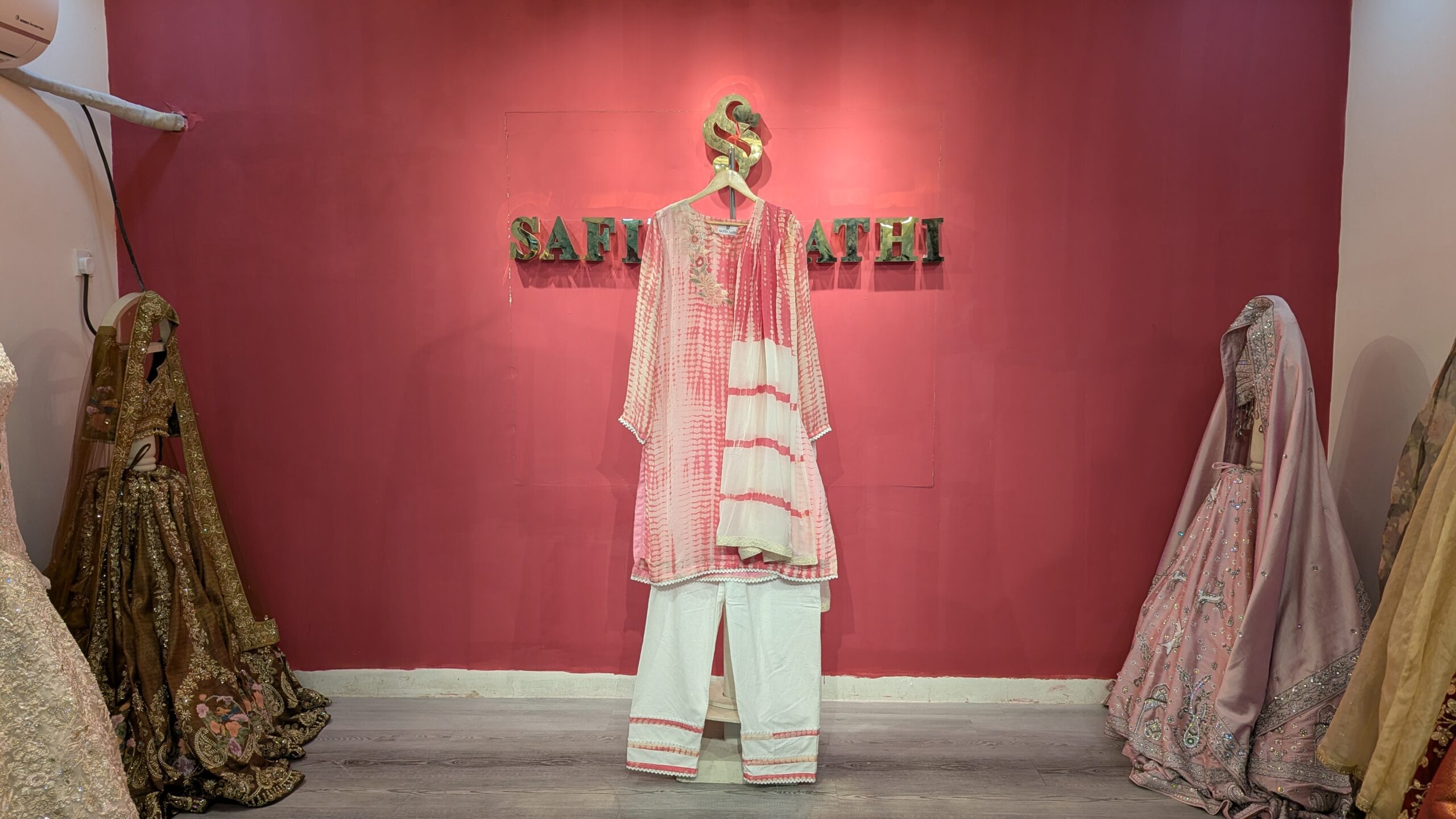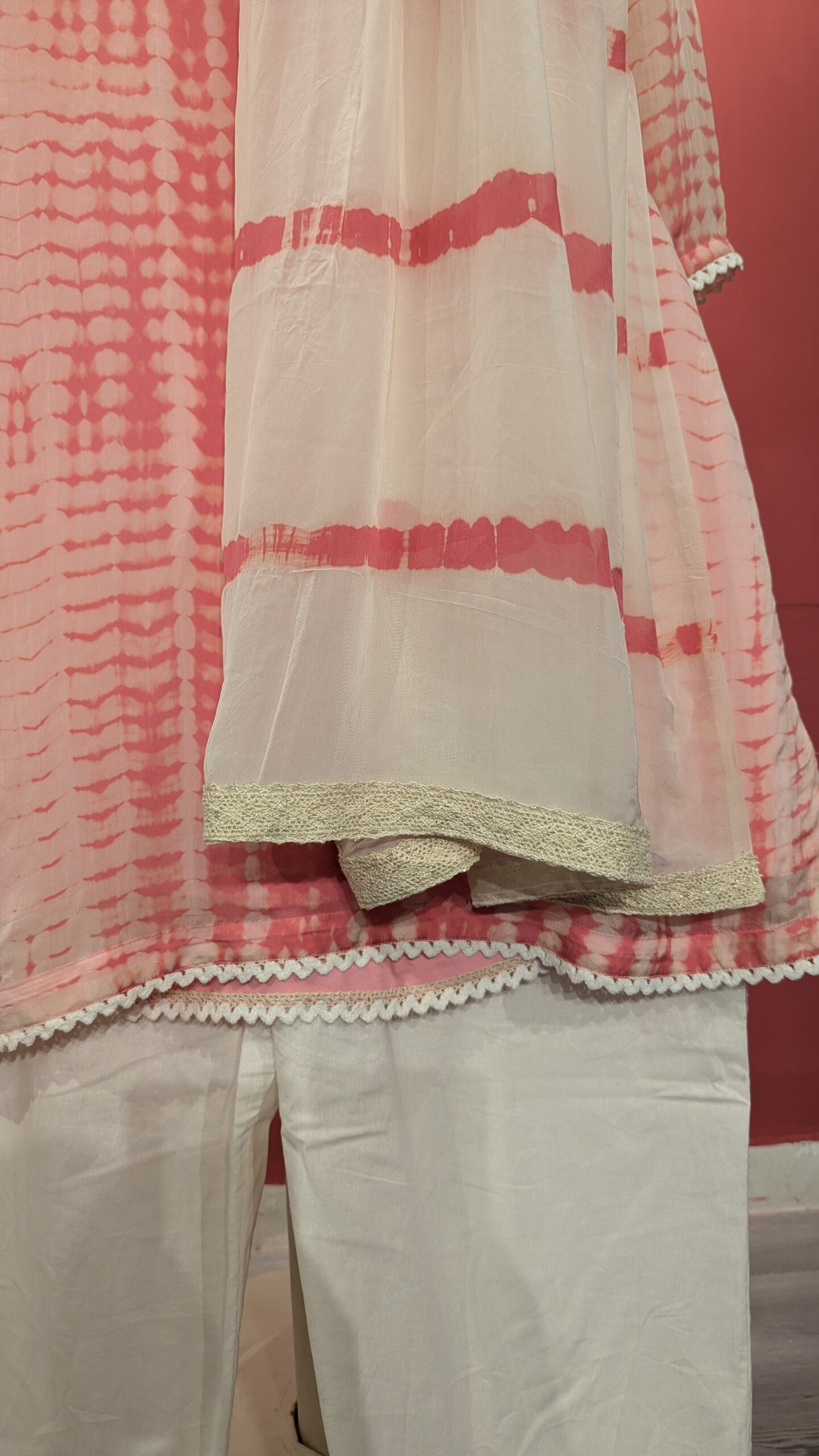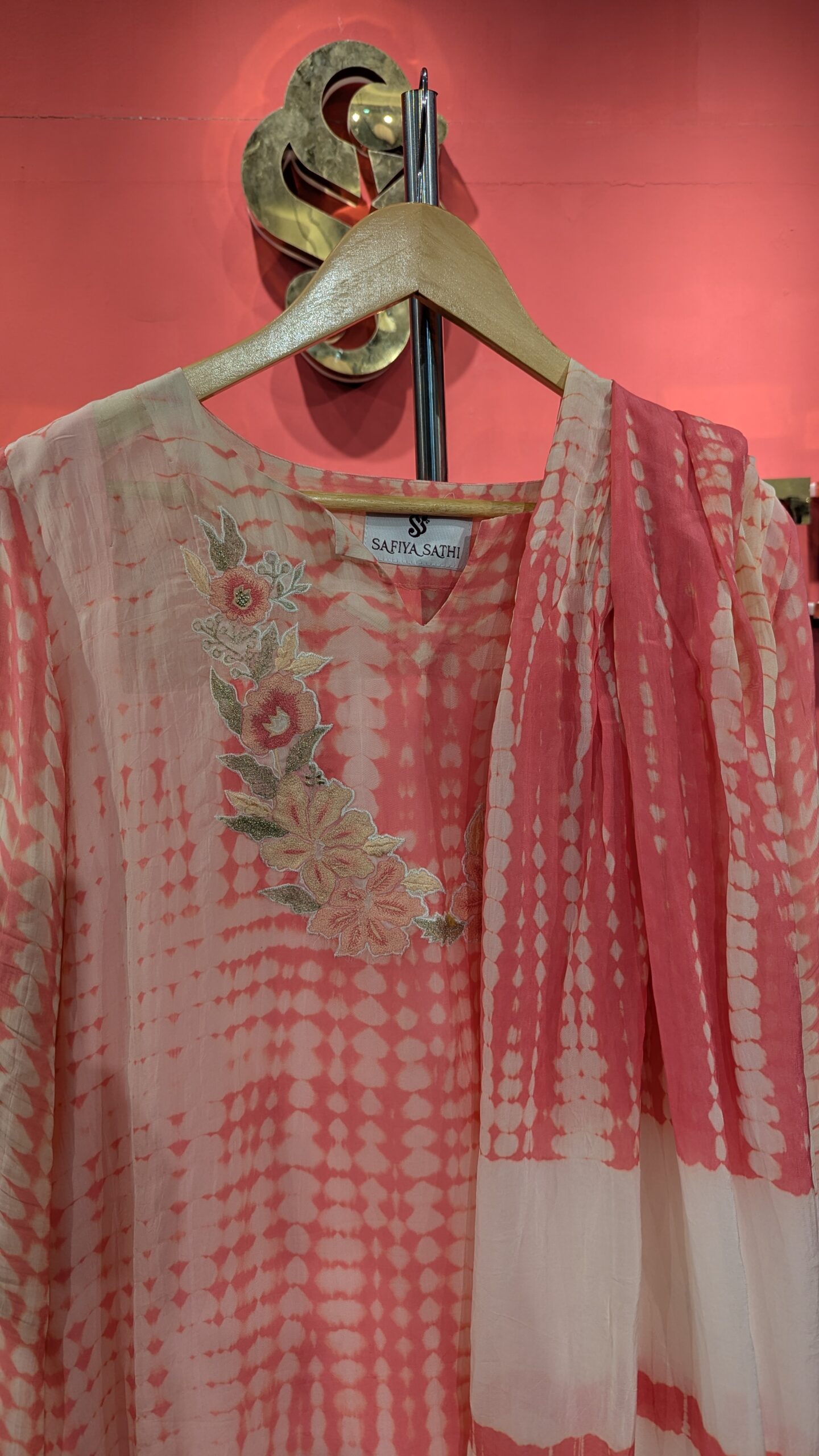 The set comes paired with a matching shibori-printed dupatta, completing the look with a cohesive, festive charm.Embrace effortless elegance with this stunning baby pink Maslin kurta set by Safiya Sathi. Crafted in soft, lightweight Maslin fabric, this ensemble features an all-over shibori tie-dye print in blush pink and white, giving it a dreamy, artisanal character.