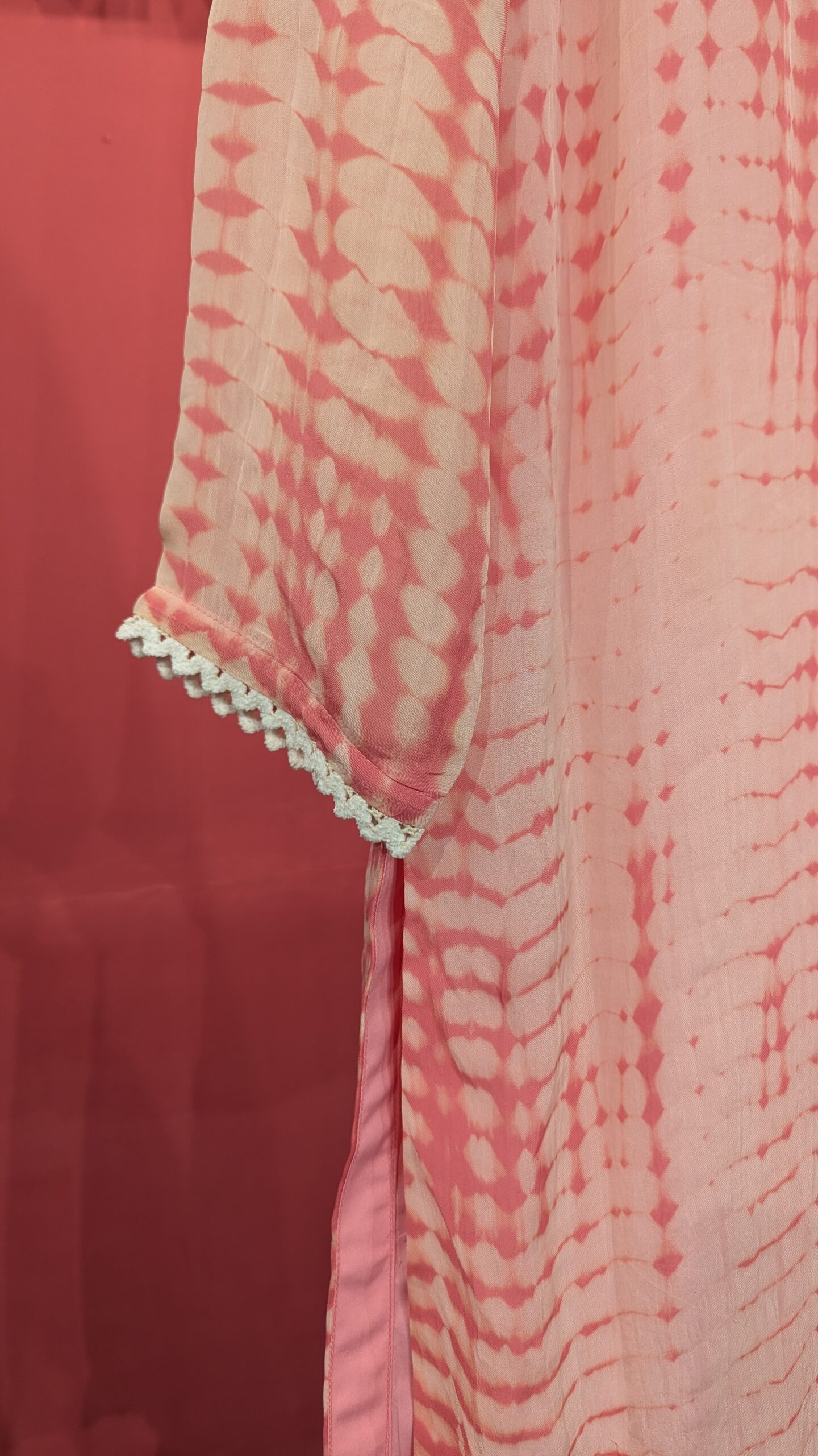 Embrace effortless elegance with this stunning baby pink Maslin kurta set by Safiya Sathi. Crafted in soft, lightweight Maslin fabric, this ensemble features an all-over shibori tie-dye print in blush pink and white, giving it a dreamy, artisanal character.