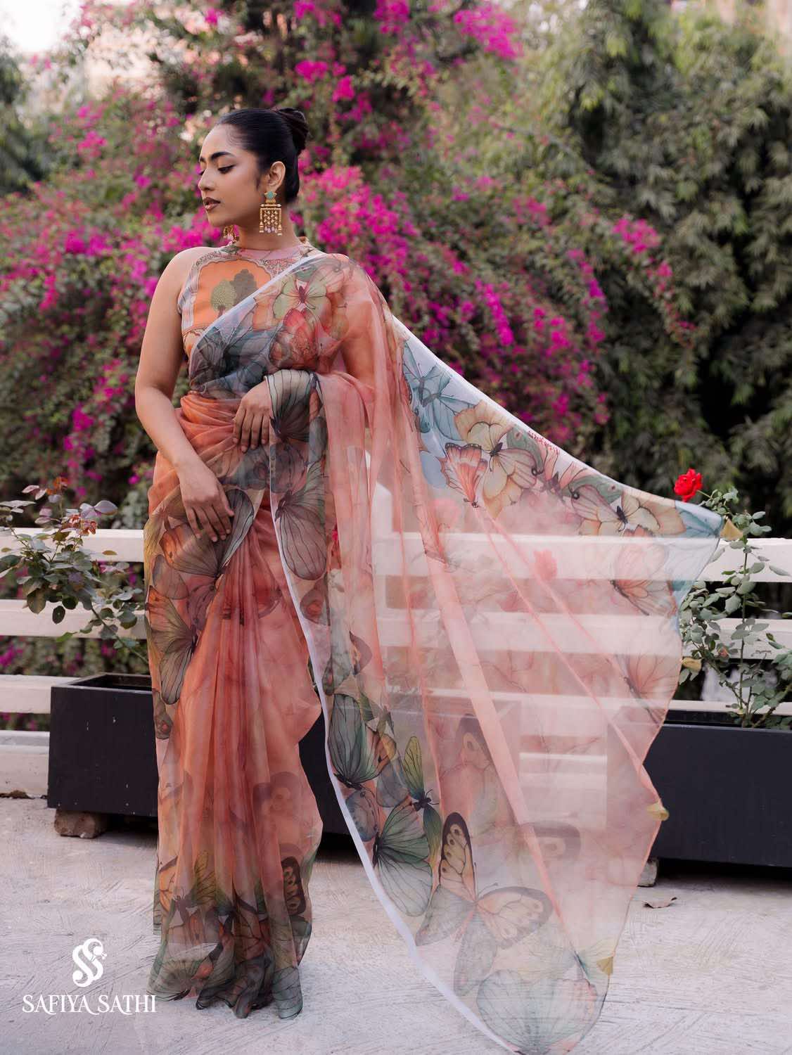 Butterfly Garden Printed Organza Saree | Eid Collection | Peach Floral Butterfly Digital Print