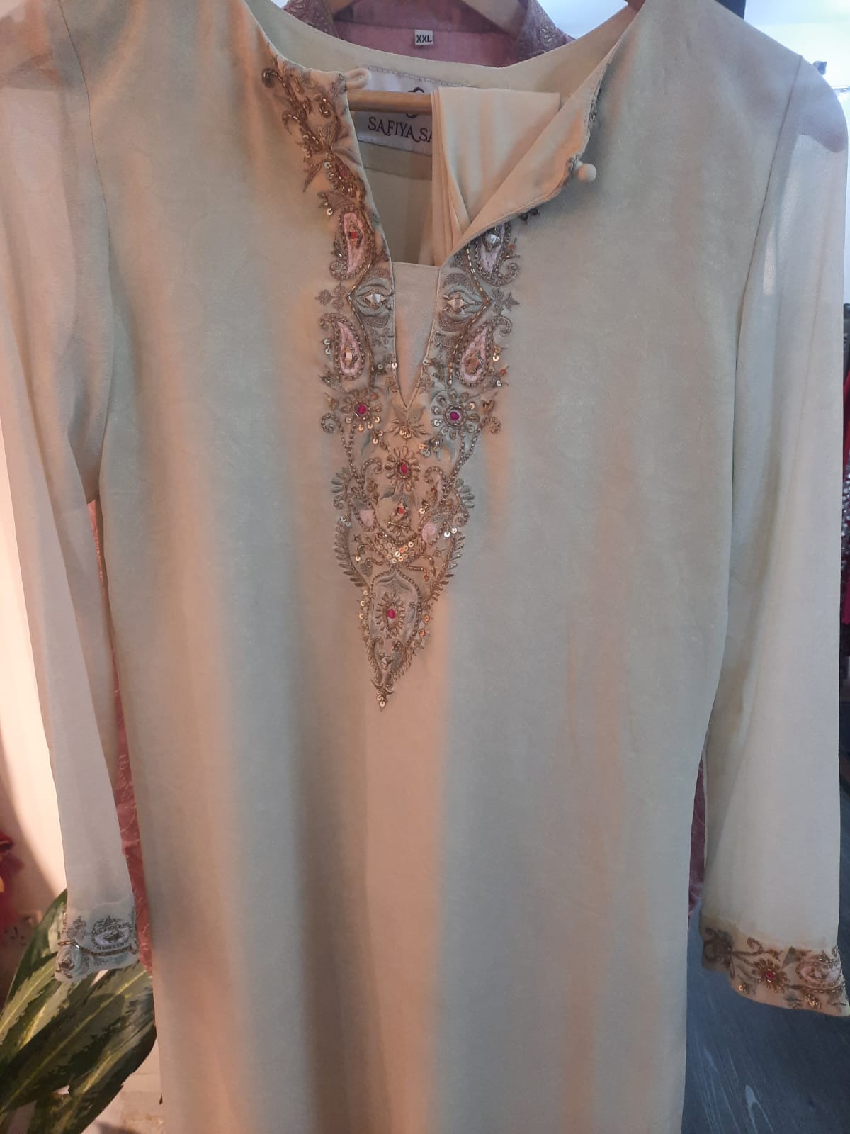 Cream Luxury Embellished Chiffon Kurta | XXL | Hand-Embroidered Neckline with Sequins & Stone Work