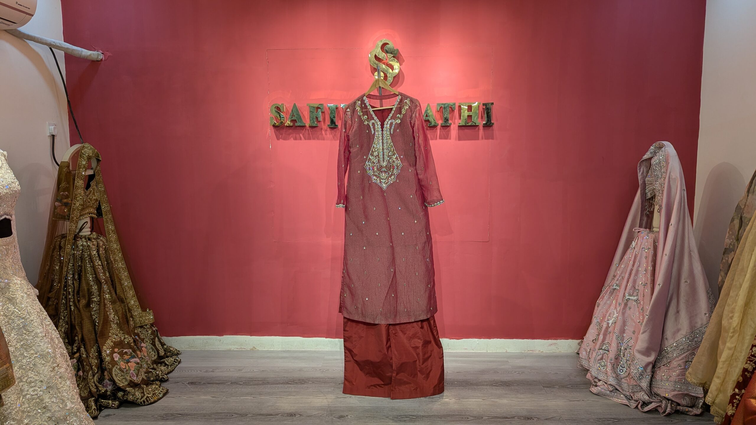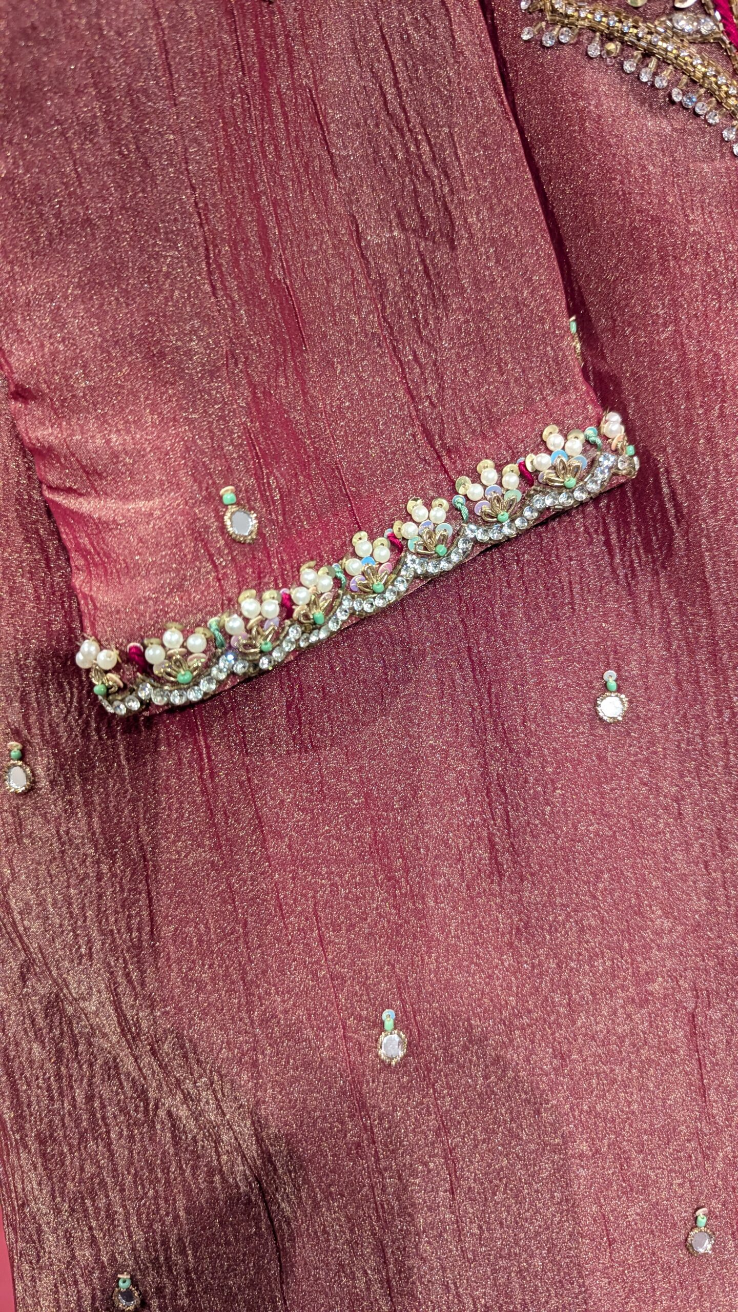 The centerpiece of this garment is its breathtaking hand-embroidered neckline panel, featuring intricate zardozi, resham, and dabka work adorned with delicate floral and paisley motifs in gold, teal, and fuchsia threads. Tiny mirror work (sheesha) detailing is scattered across the body, catching the light beautifully with every movement. The neckline and sleeve cuffs are finished with elegant pearl and sequin borders for a polished, bridal-ready look.