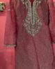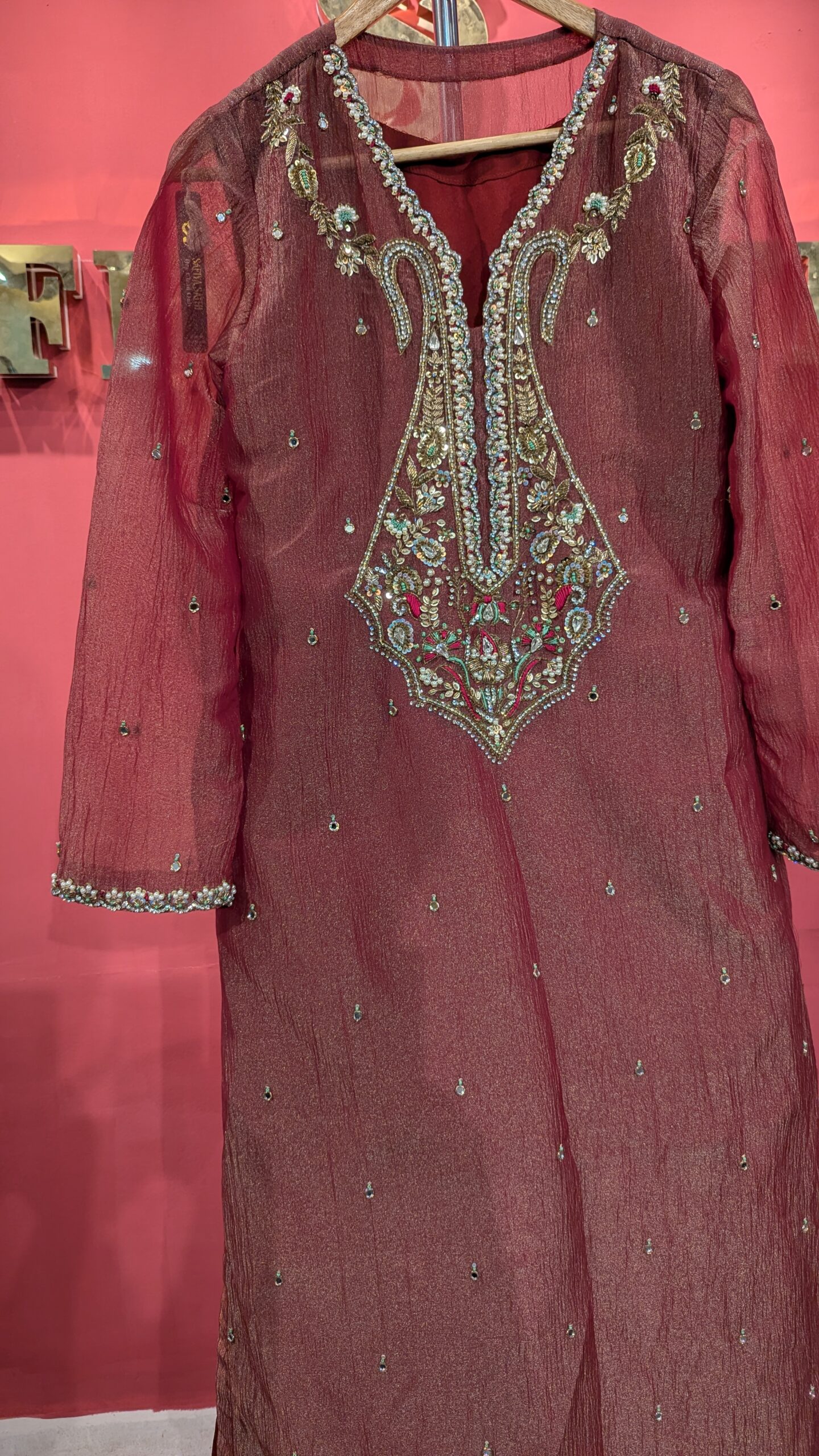 This exquisite kurti is crafted from luxurious crush silk in a rich crimson-gold tone that radiates elegance and sophistication. The fabric features a beautiful crinkled texture that drapes gracefully, making it perfect for both formal gatherings and celebratory occasions.