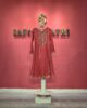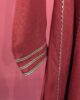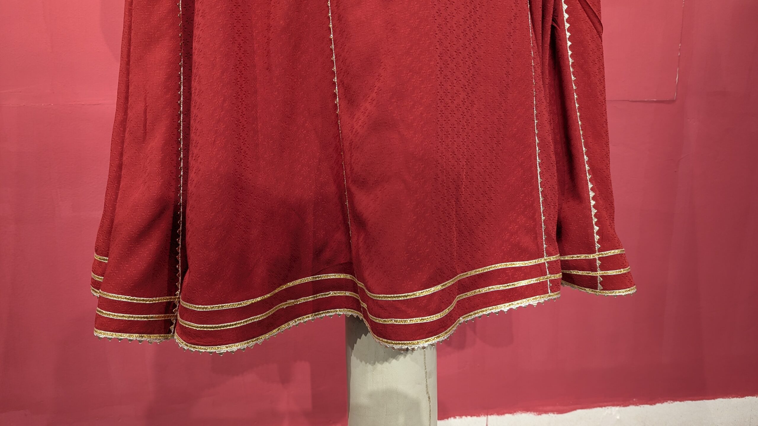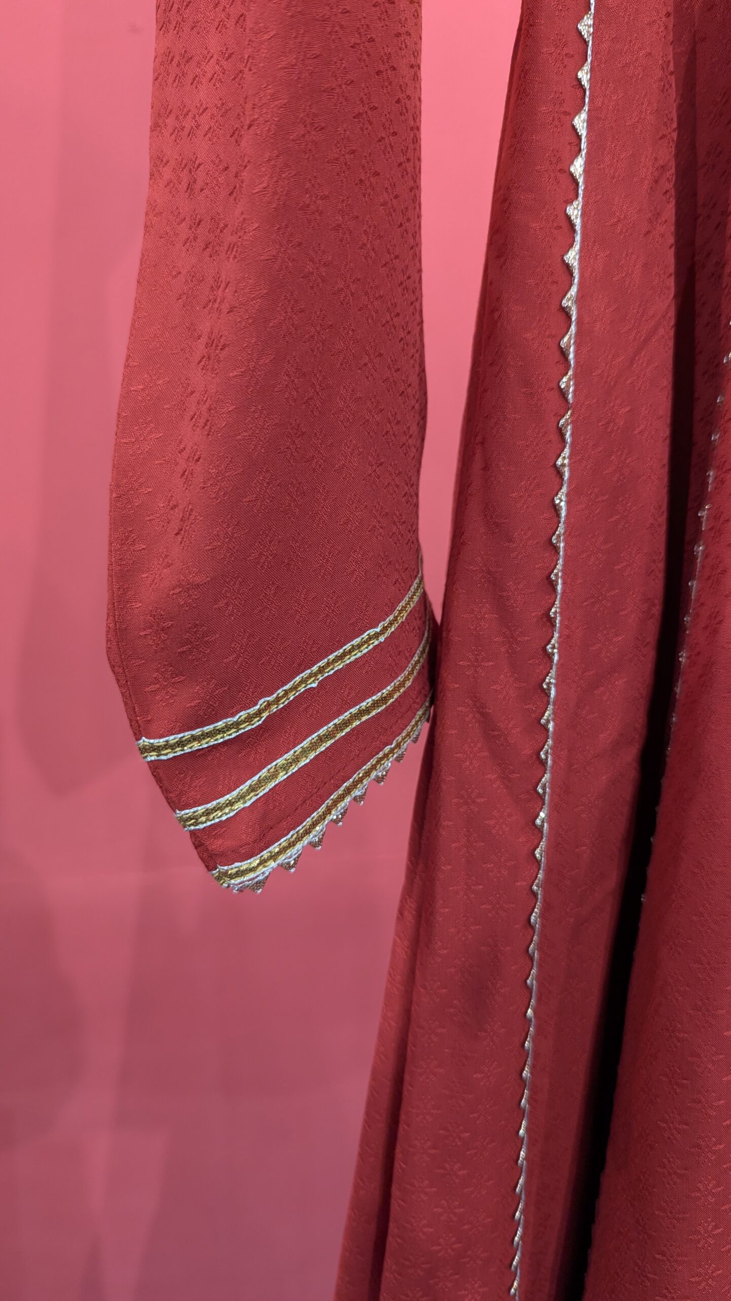The rich crimson fabric is complemented by fine gold lace detailing running along the front panels and sleeves, adding a subtle yet sophisticated touch. The classic notched neckline with a front keyhole opening gives it a refined, traditional silhouette, while the straight-cut long length and full sleeves make it modest and versatile.