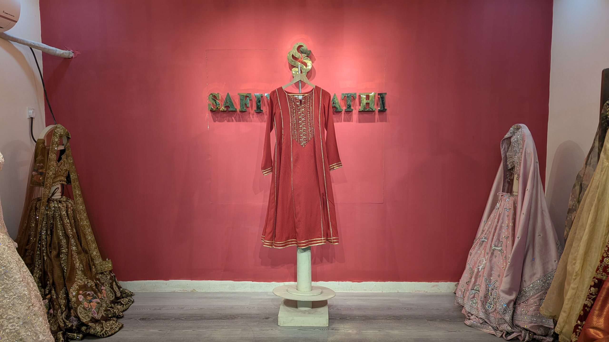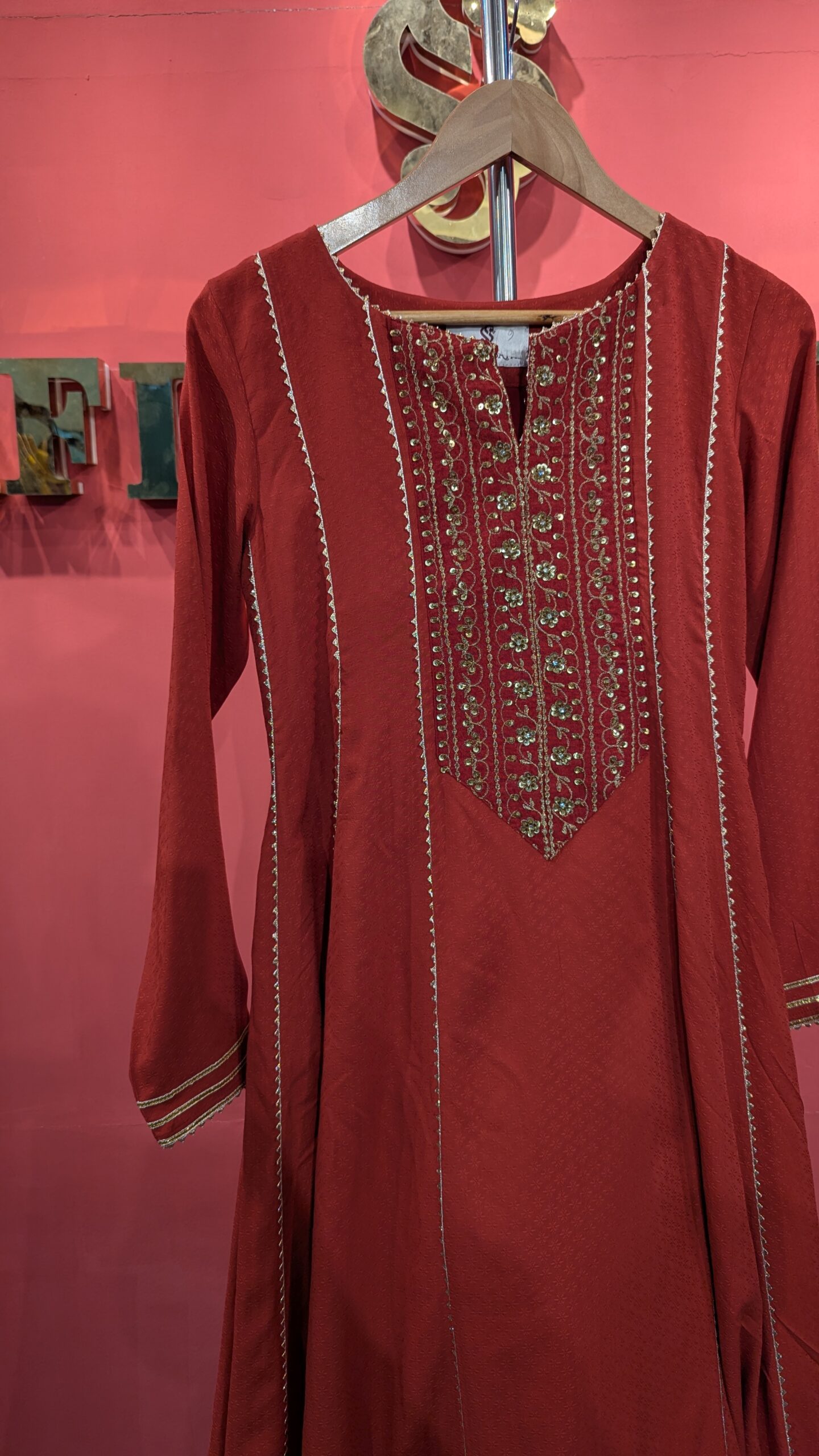 Elevate your ethnic wardrobe with this stunning deep red linen kurti, crafted for women who appreciate timeless elegance and artisanal craftsmanship. The garment features an intricately hand-embroidered yoke adorned with delicate floral motifs, golden zari threadwork, and shimmering sequins — all meticulously hand-stitched by skilled artisans.