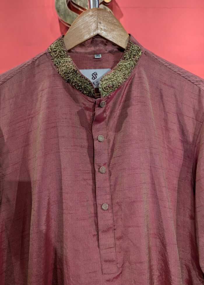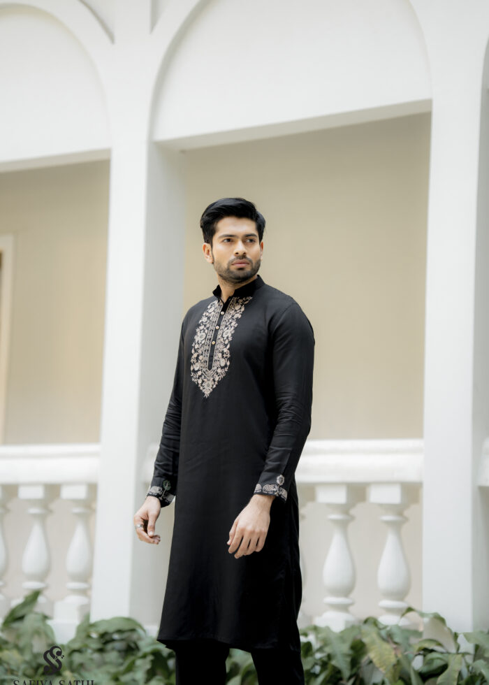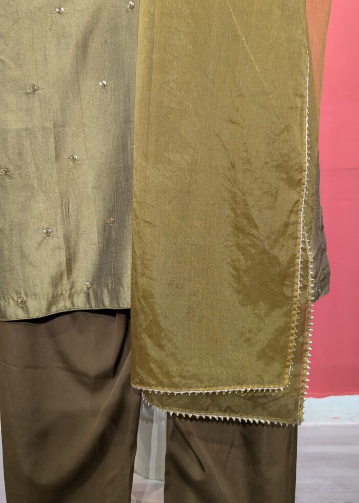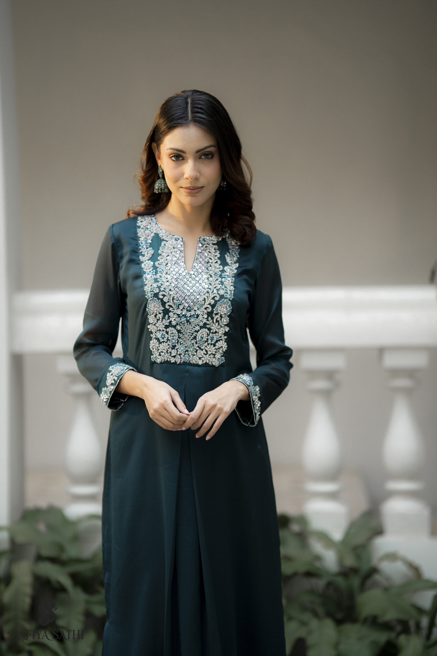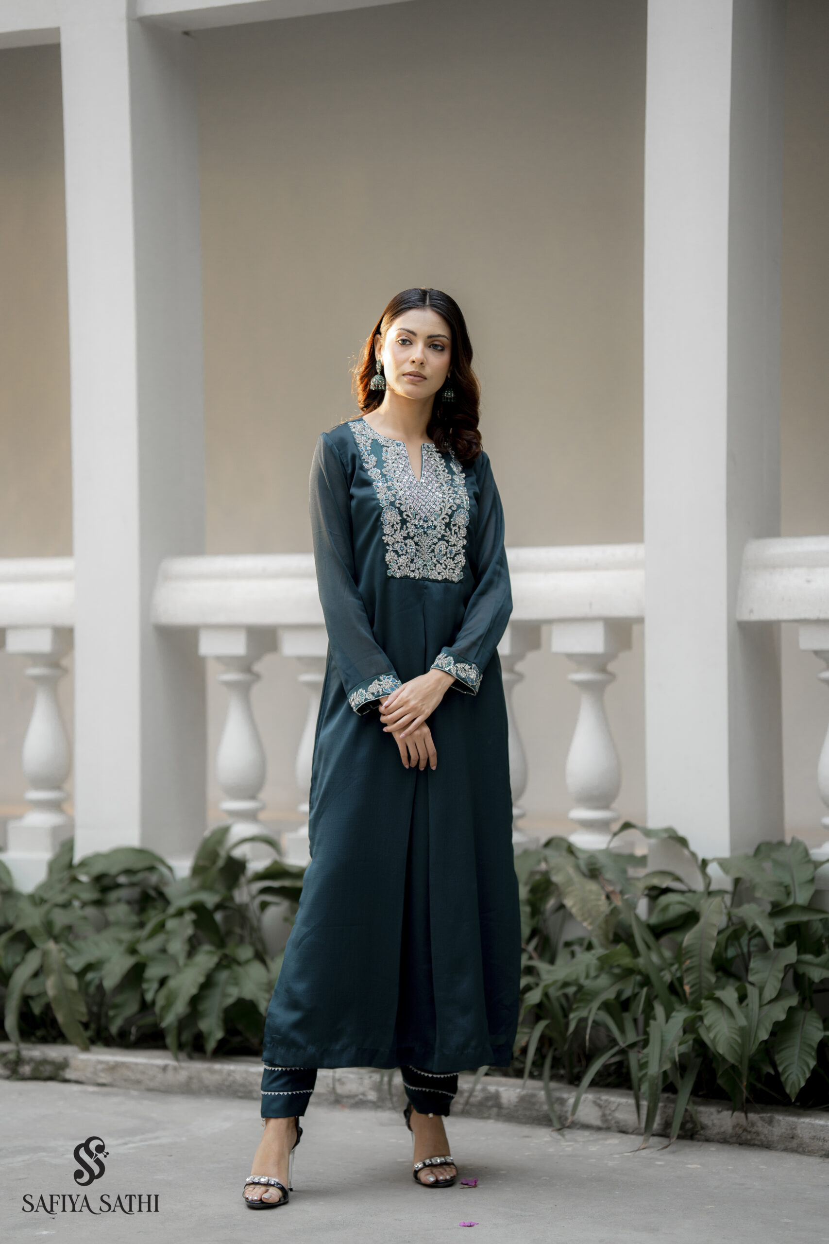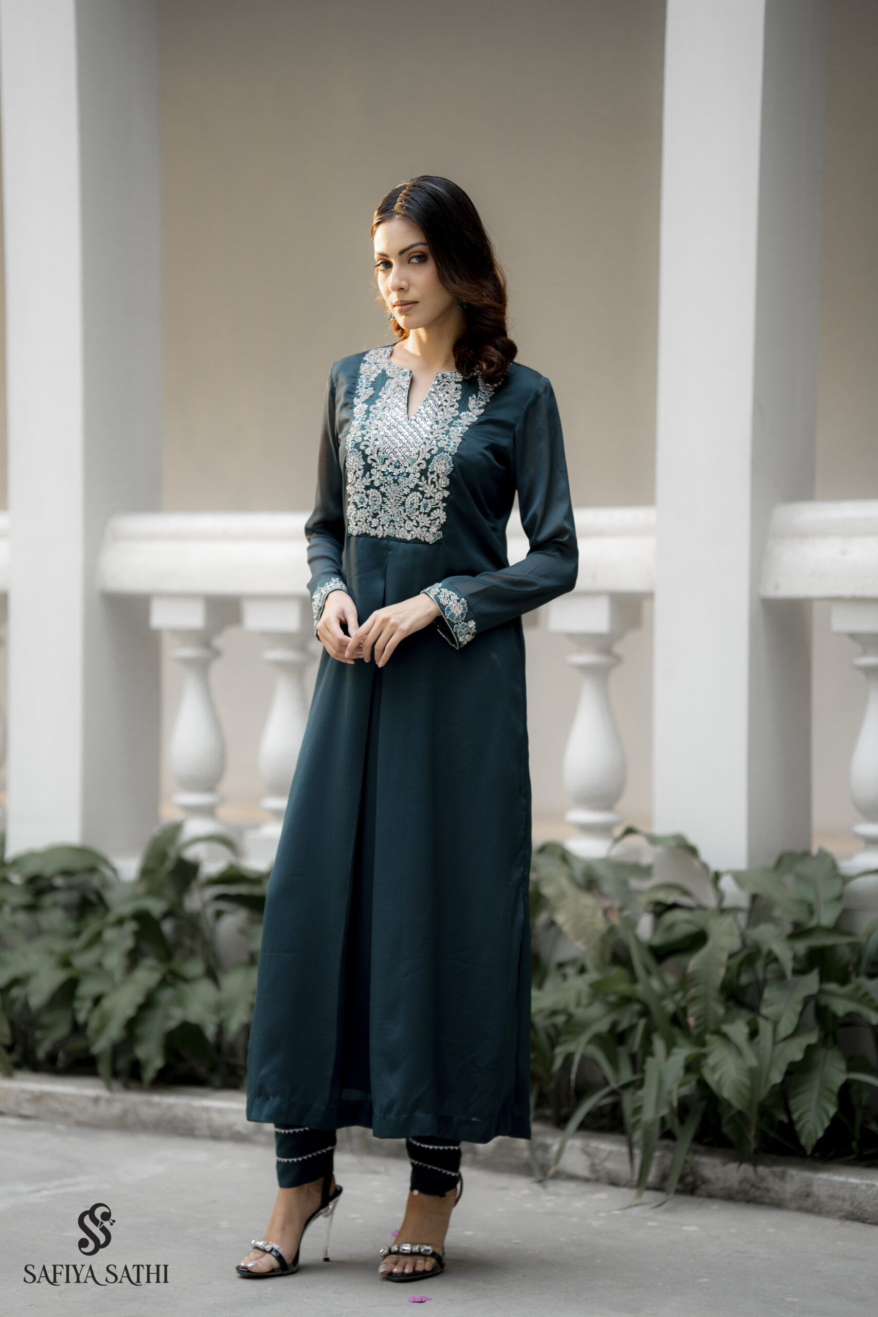 The fluid, long-line silhouette of the kurta falls beautifully with a subtle front drape, enhanced by the natural sheen and softness of chinon fabric. Paired with slim-fit straight pants featuring embroidered hemline detailing, the look is complete, cohesive, and effortlessly chic.