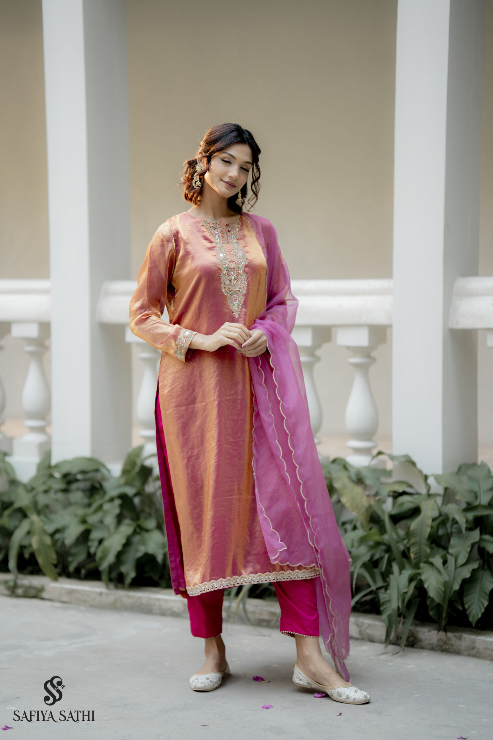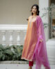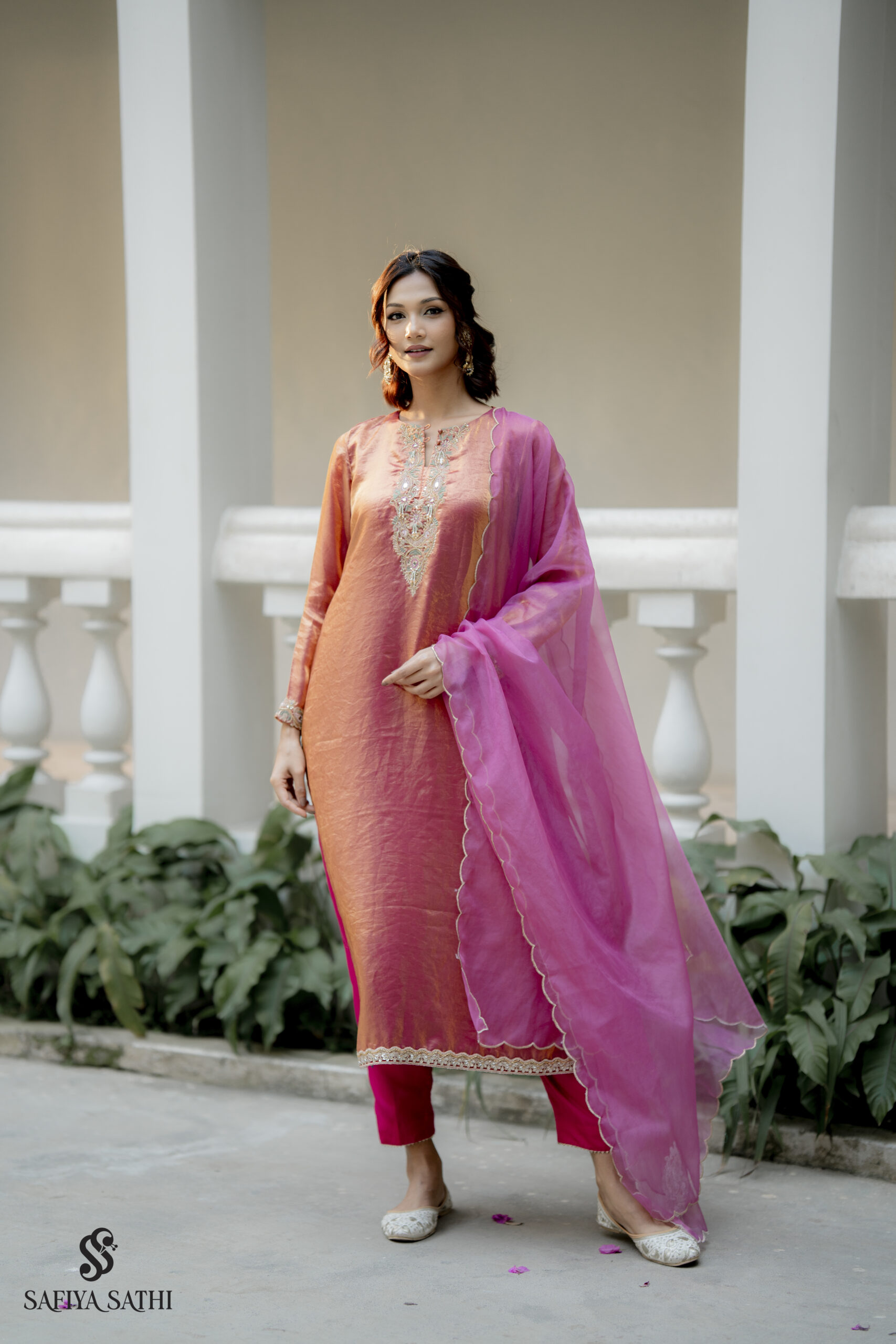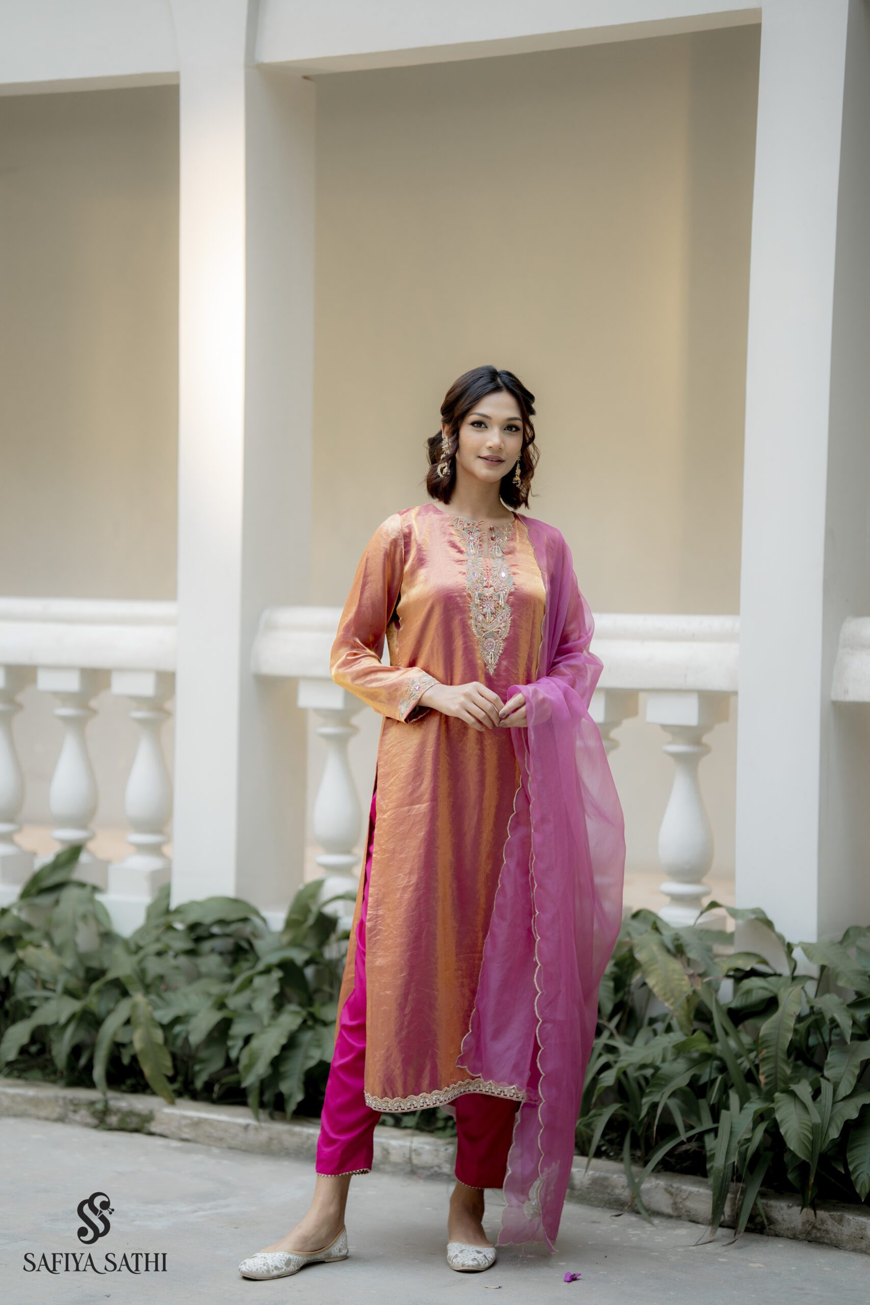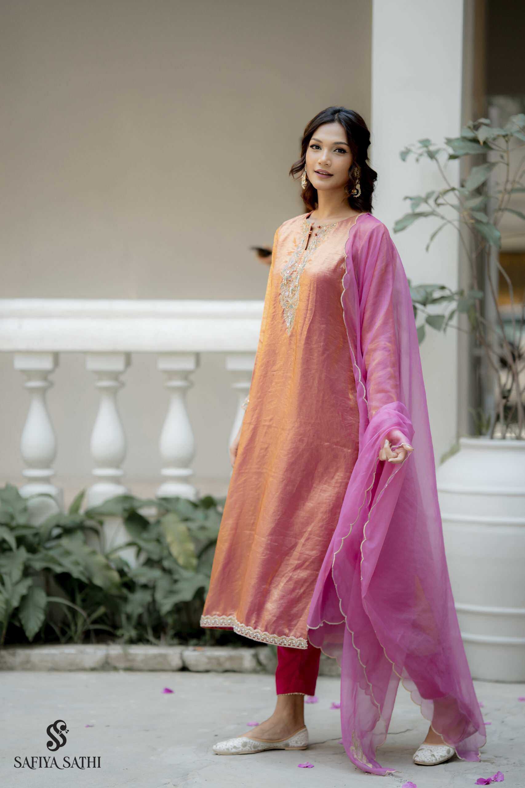 Draped in the warmth of a setting sun, the Gulnar set by Safiya Sathi is a celebration of timeless femininity and artisanal craft. The kurta is fashioned from a lustrous dual-toned silk that transitions seamlessly from golden orange to a deep rose-pink, creating a natural iridescence that catches the light with every movement.
