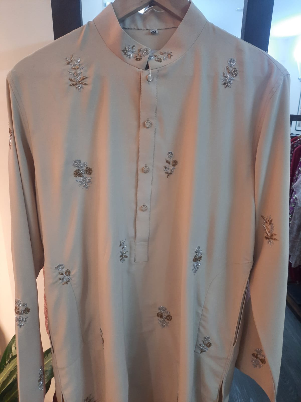 This elegantly crafted full-sleeve Panjabi features delicate floral embroidery motifs scattered across the fabric, adorned with silver and gold zari threadwork along with subtle sequin embellishments — giving it a refined, celebratory look without being overly heavy.