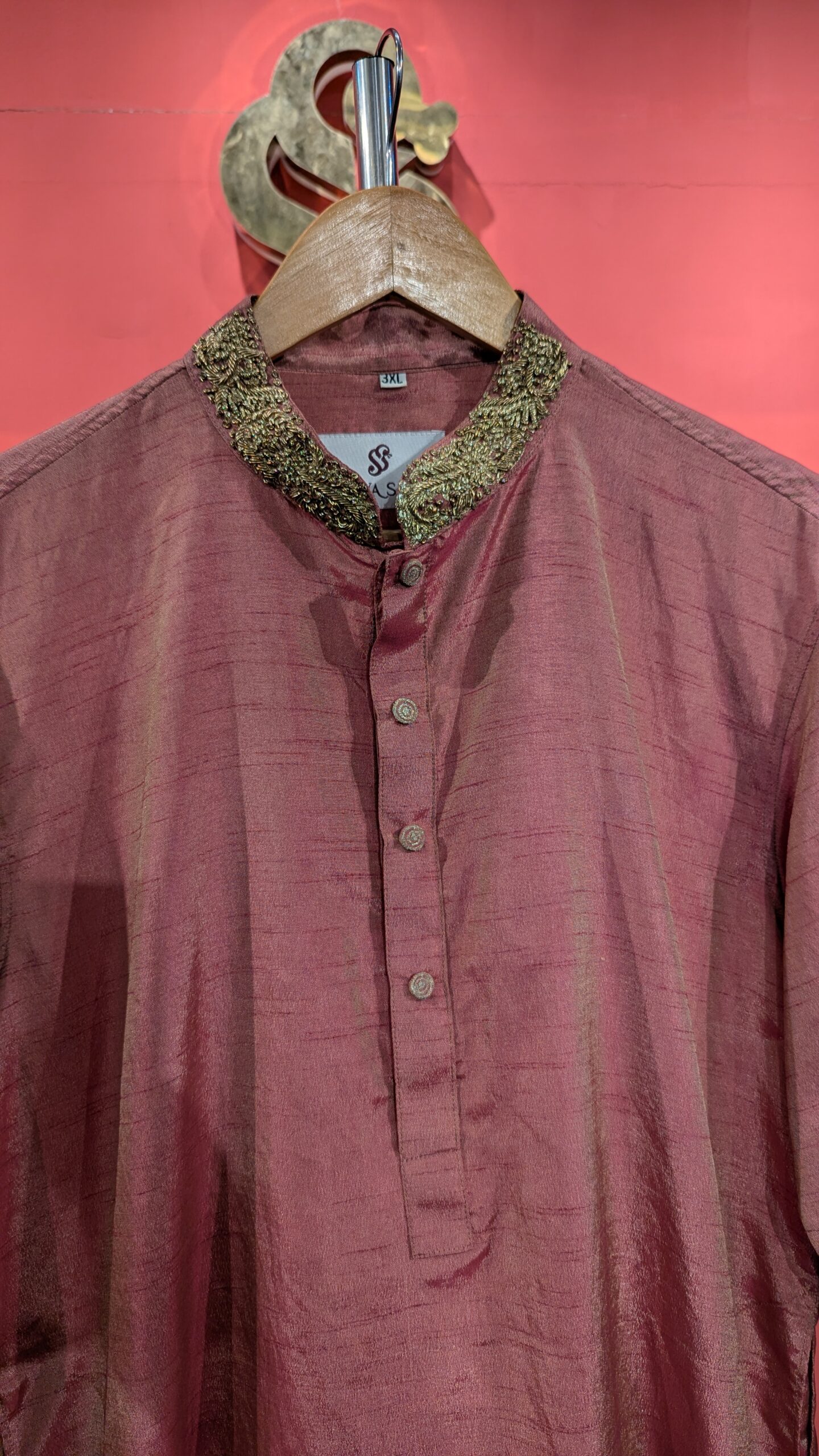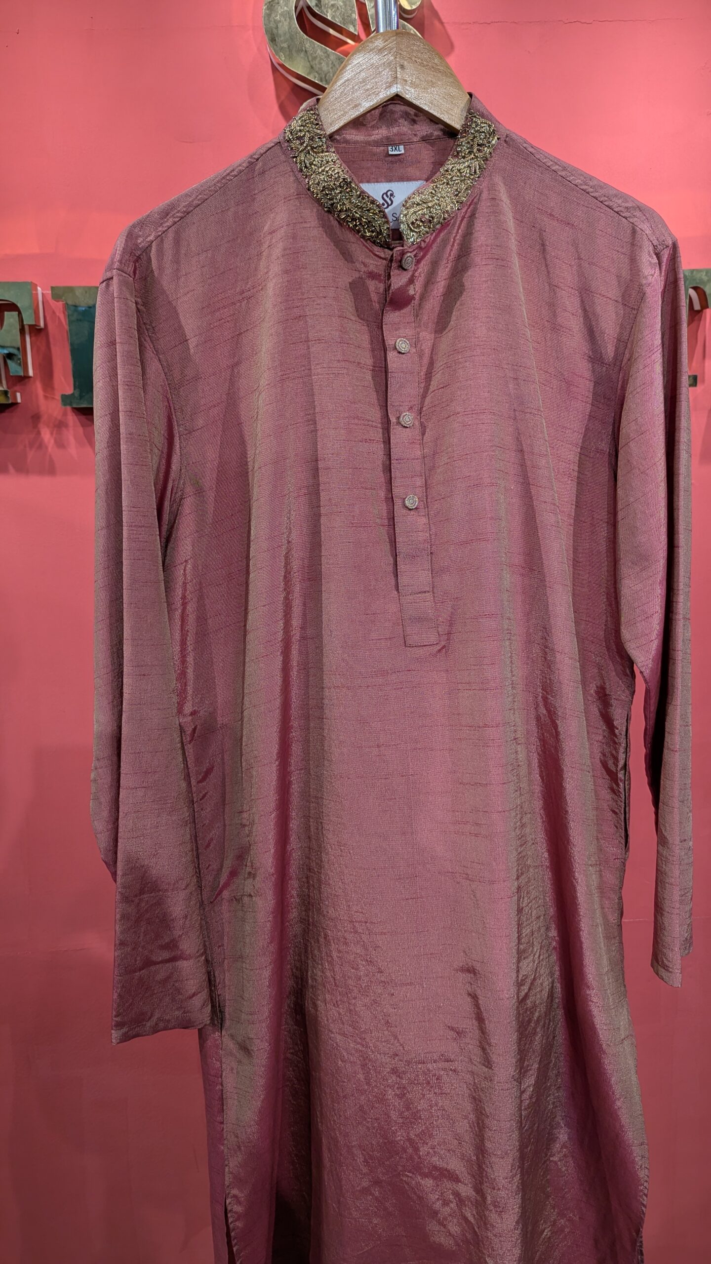Elevate your festive wardrobe with this exquisitely crafted men’s kurta from Safiya Sathi. Made from luxurious crush silk, this piece features a rich dusty rose / rusty pink tone with a natural textured finish that catches the light beautifully, giving it an effortlessly regal appeal.