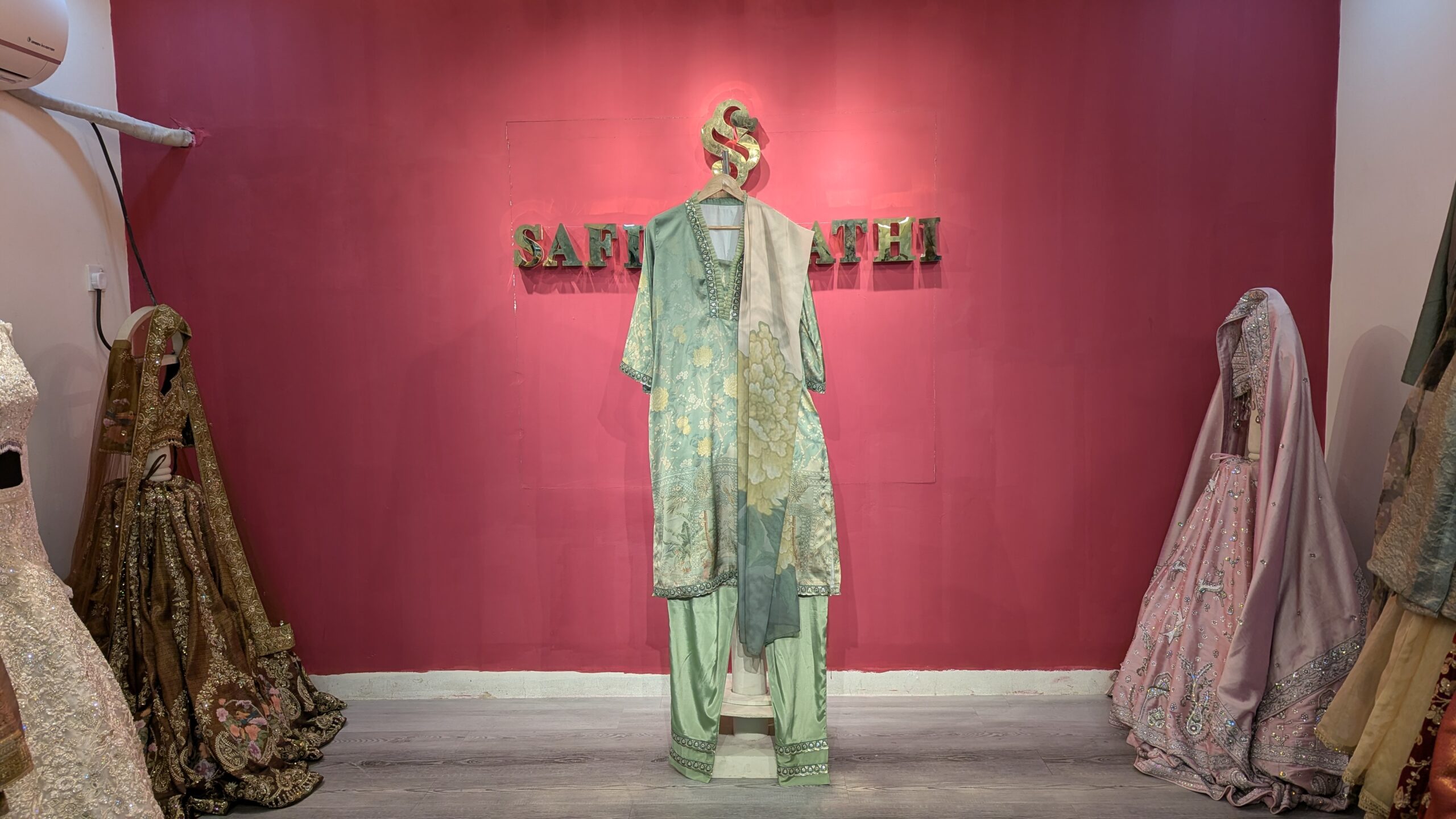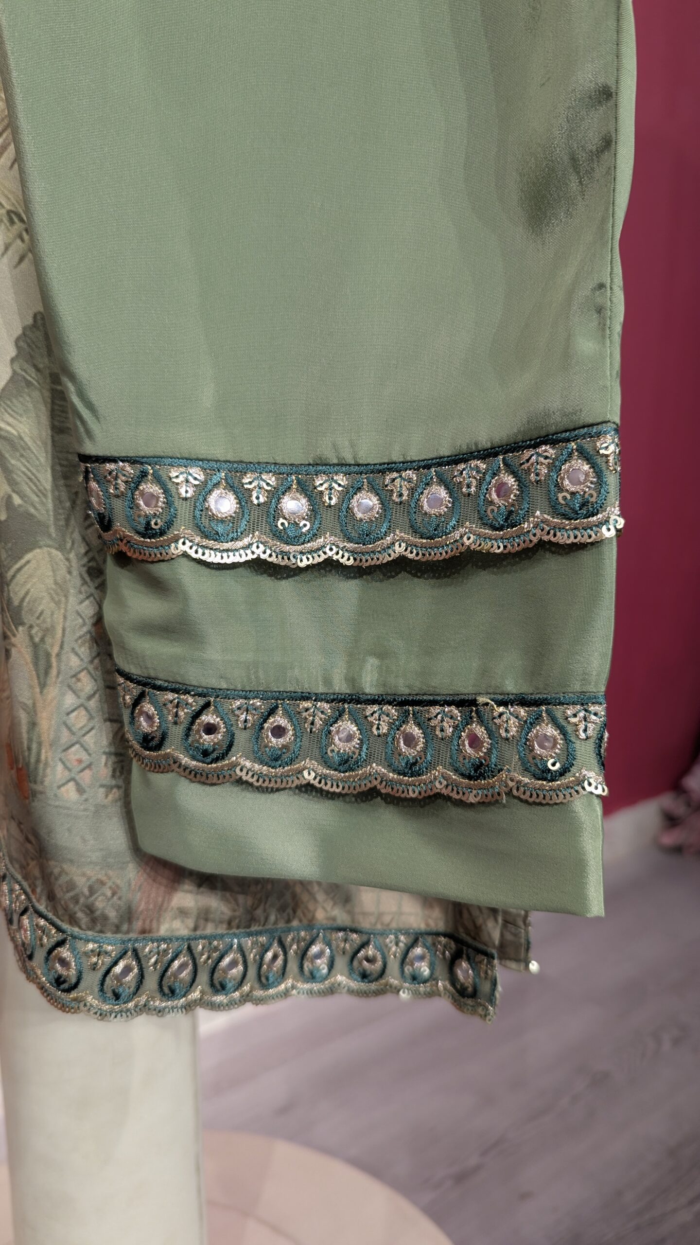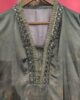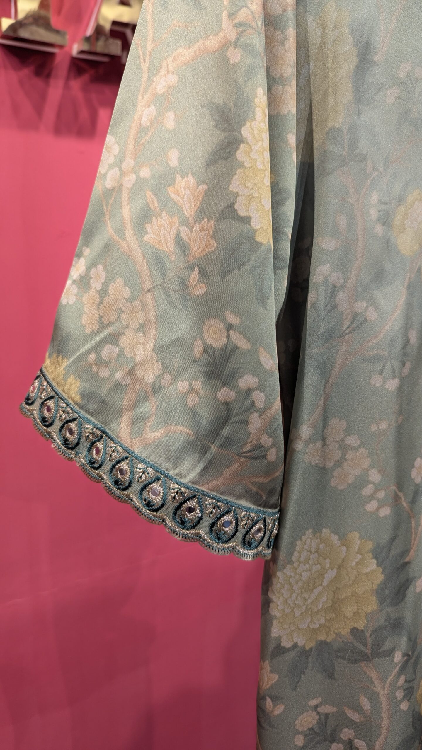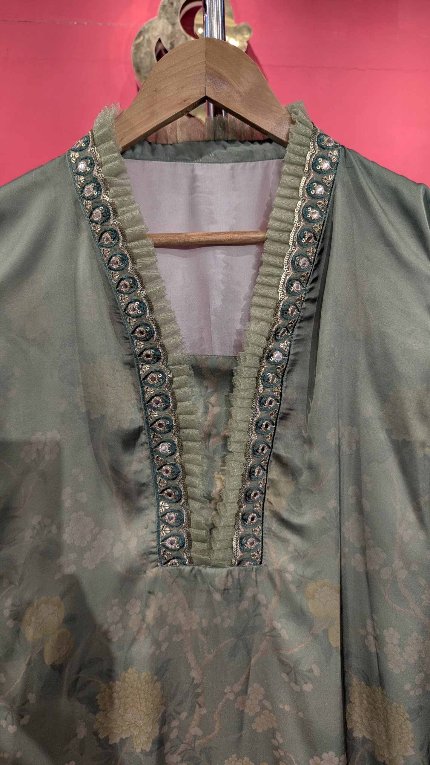 Elevate your ethnic wardrobe with this exquisite sage green silk kurta, crafted for women who appreciate the artistry of traditional South Asian fashion. The fabric features a luxurious floral jacquard weave with golden chrysanthemum and blossom motifs woven directly into the silk, giving it a rich, dimensional texture that catches the light beautifully.